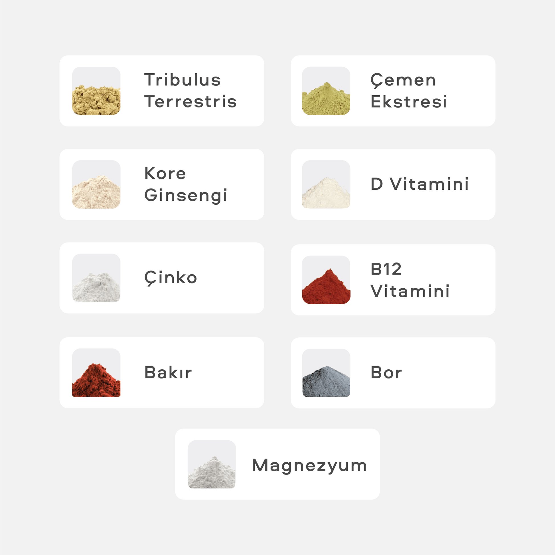 Demir Dikeni, Ginseng ve Çemen Ekstresi; doğal testosteron seviyelerini ve libidoyu destekler. Çinko, Bor, Vitamin B12 ve Bakır hormonal dengeyi koruyarak genel erkek sağlığını güçlendirir.